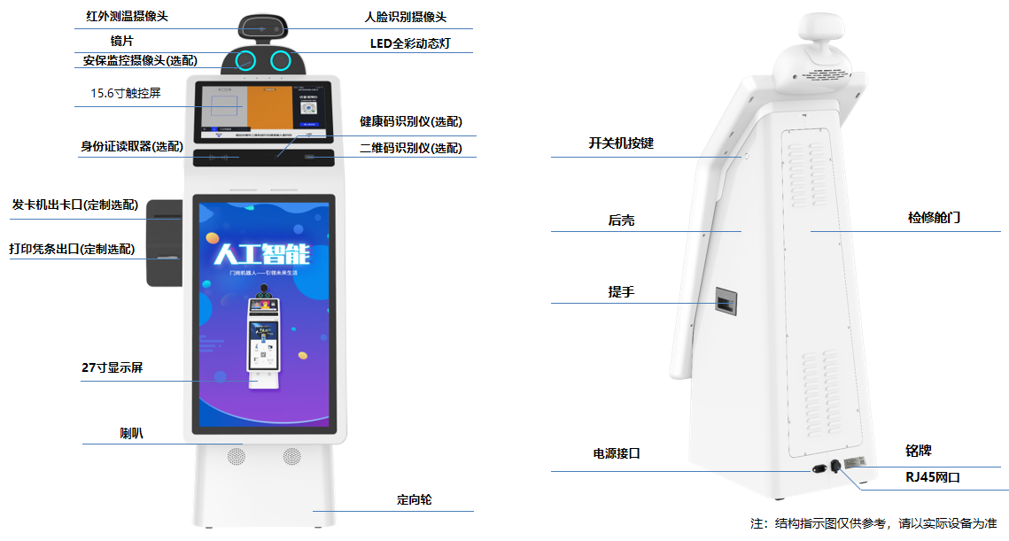 睿盾智能测温门岗机器人M5120B008B是一款针对医疗、写字楼、事业单位、校园、商场、社区及公寓等公共场所开发的室内门岗机器人。具备人流分析和访客管理功能,亦支持定制服务。